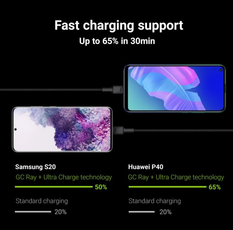 Kabel podporuje rychlé nabíjení díky kompatibilitě s technologiemi jako Quick Charge 3.0, GC Ultra Charge, Samsung AFC a Huawei FCP/SCP. To umožňuje nabíjet zařízení až třikrát rychleji než standardní nabíječky. Rychlost přenosu dat až 480 Mbps zajišťuje rychlou a efektivní synchronizaci souborů mezi zařízeními.
