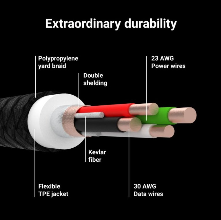 - Materiál: Odolný opletený kabel s kevlarovými vlákny