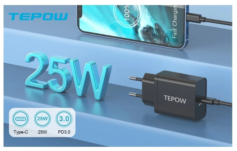 Rychlonabíječka 25W s USB-C konektorem od značky Tepow je ideálním společníkem pro rychlé a efektivní nabíjení vašich elektronických zařízení.