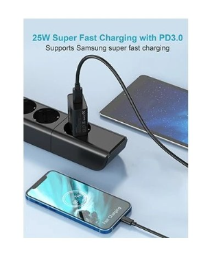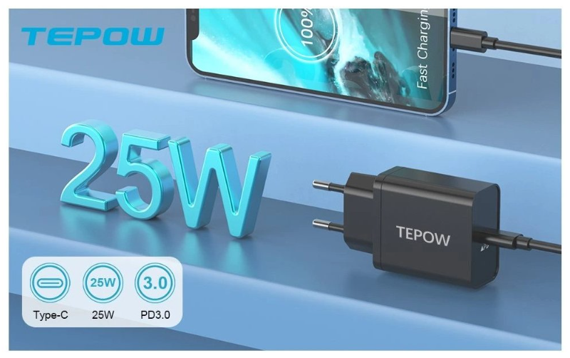 Tepow Univerzální nabíječka, 25W Adaptér + kabel USB-C, černá