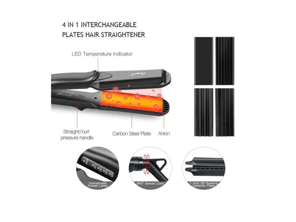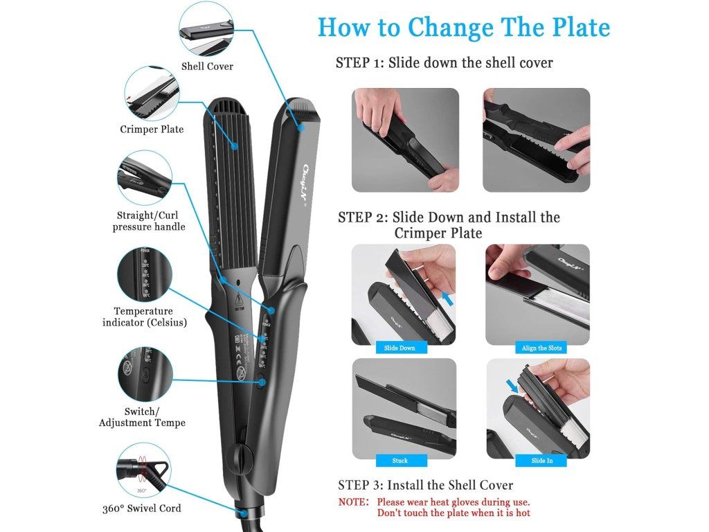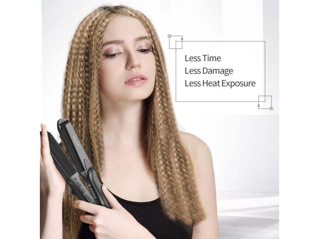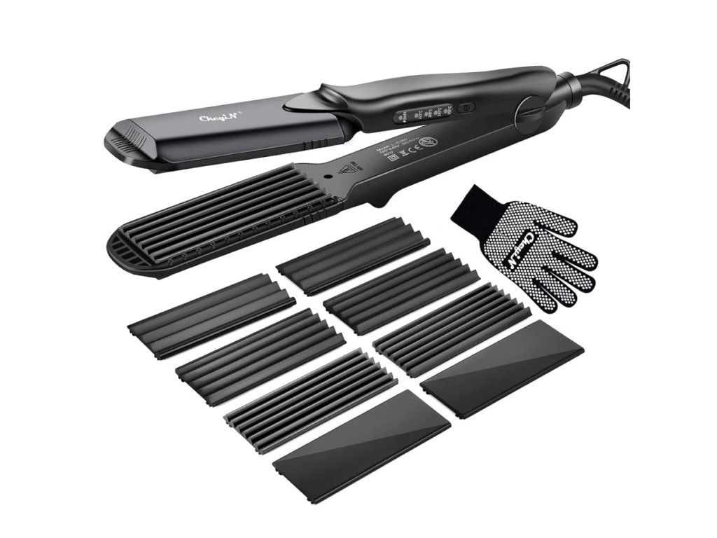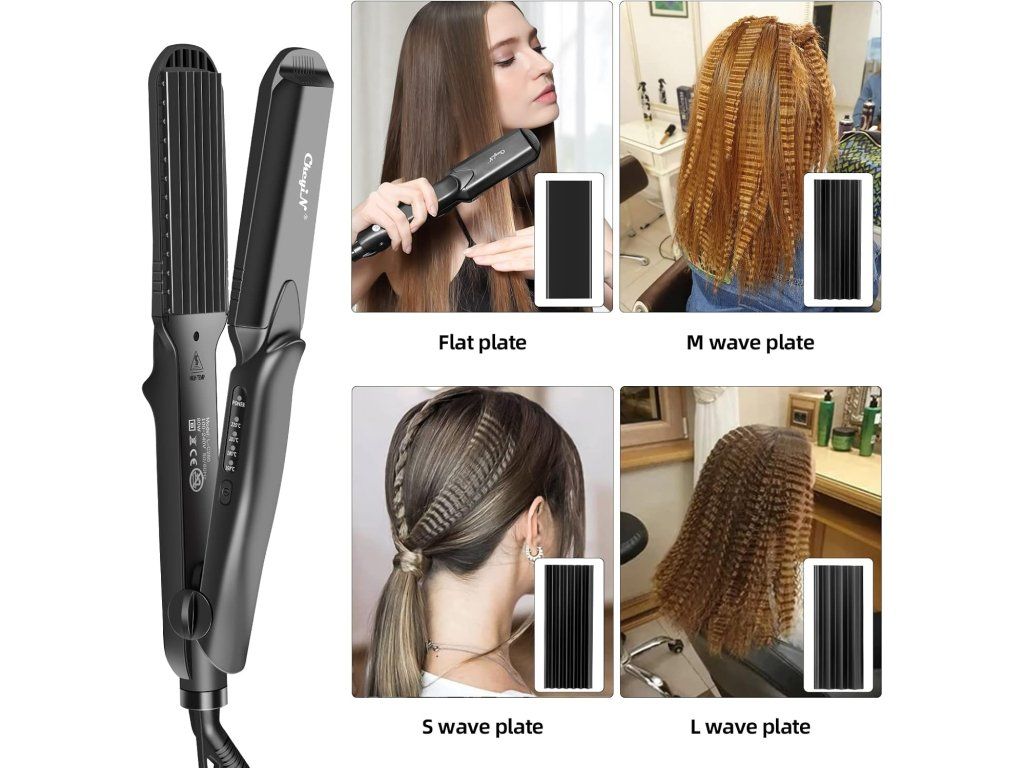 Čtyři vyměnitelné keramické desky (1 rovná + 3 typy vln) vám umožní vytvářet hladké účesy, výrazné krepování i přirozené plážové vlny. Díky tomu můžete vlasy žehlit, nebo vytvořit krepovitý efekt.