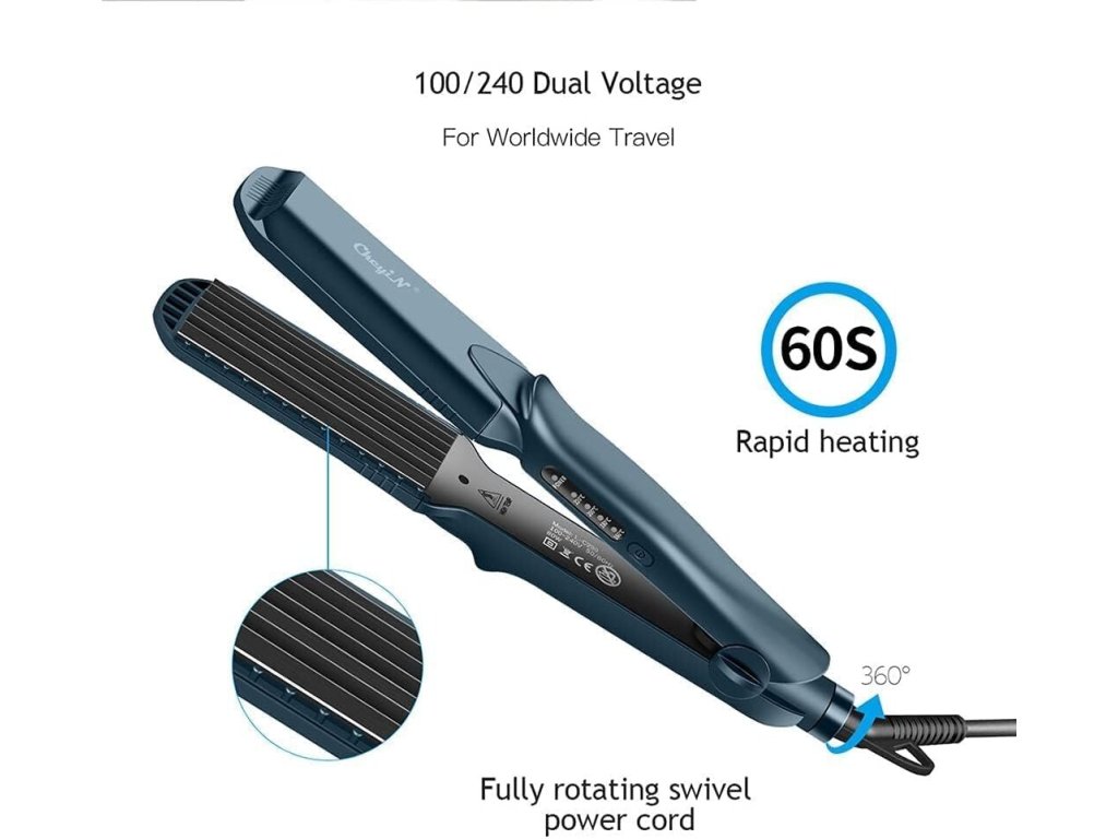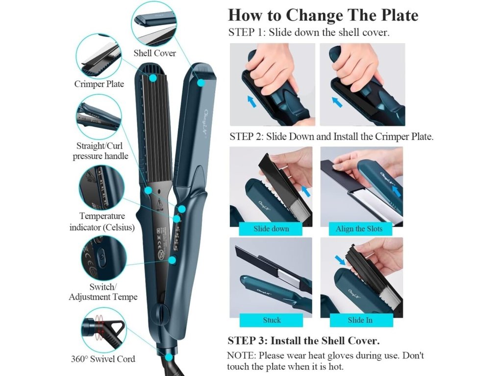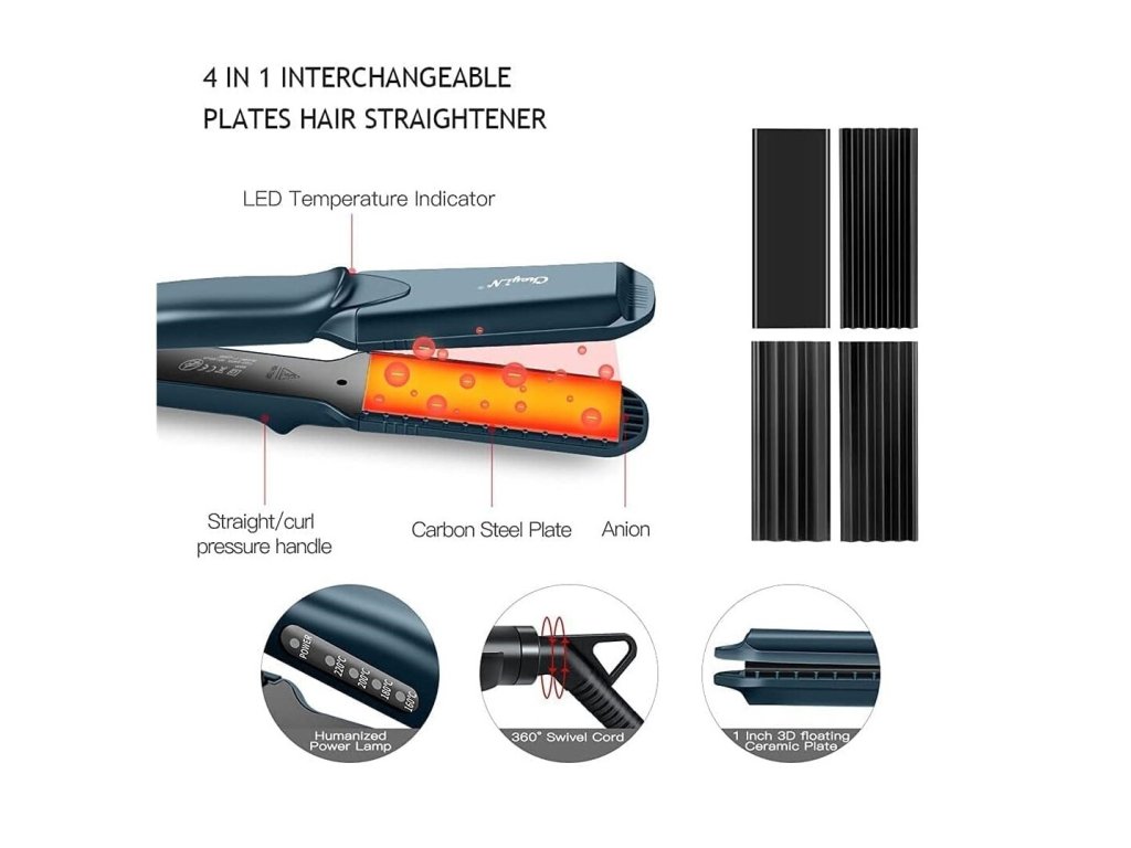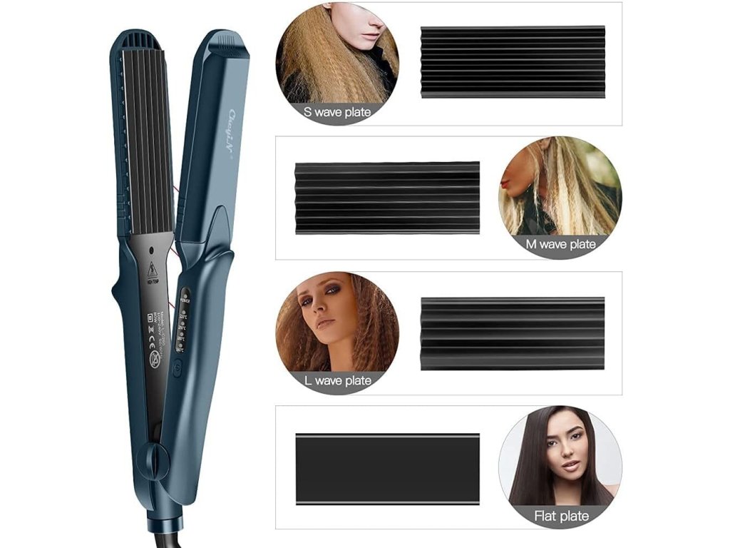 Čtyři vyměnitelné keramické desky (1 rovná + 3 typy vln) vám umožní vytvářet hladké účesy, výrazné krepování i přirozené plážové vlny. Díky tomu můžete vlasy žehlit, nebo vytvořit krepovitý efekt.