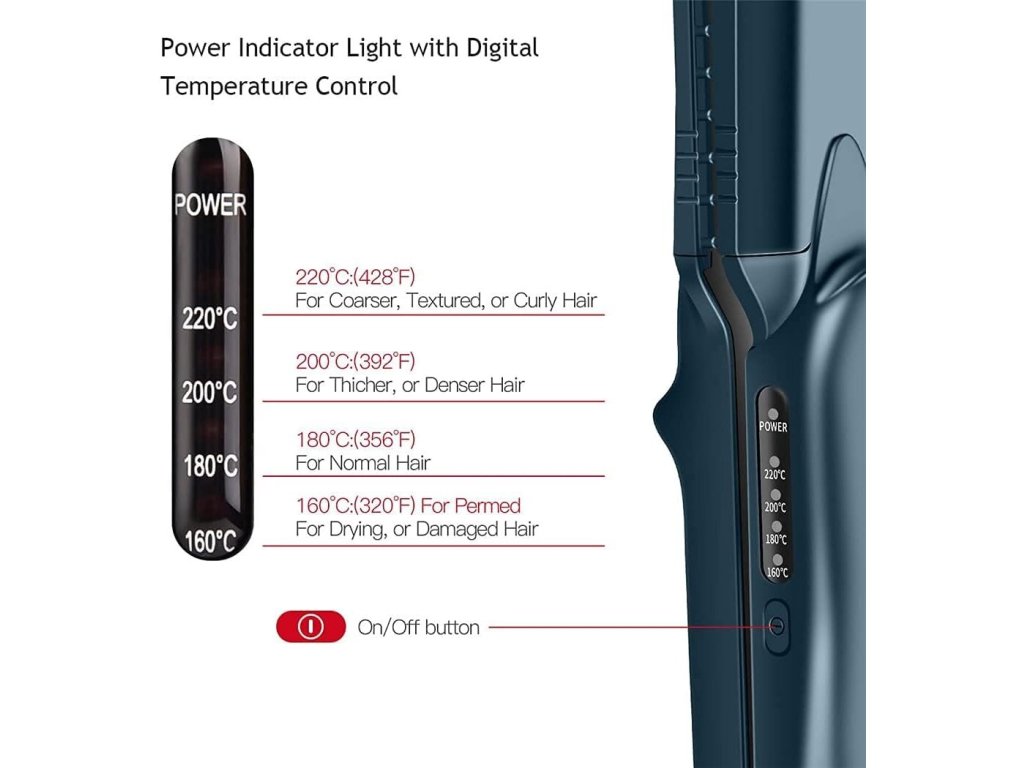 Žehlička nabízí 4 nastavení teploty pro jemné, normální i husté vlasy. Teplotu jednoduše přizpůsobíte svému typu vlasů – od 160 °C pro jemné a barvené vlasy až po 220 °C pro silné a nepoddajné prameny.
