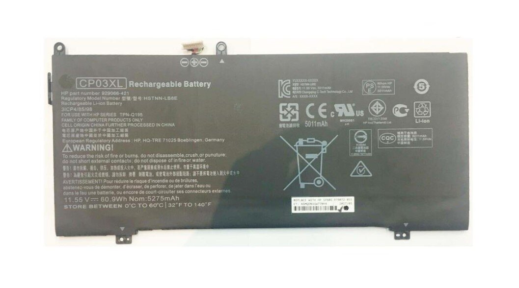 Baterie pro notebooky HP Spectre x360 s kapacitou 60,9 Wh může nahradit následující čísla dílů baterií: CP03XL, CP03060XL, CPO3XL, HSTNN-LB8E, 929066-421, 929072-855, TPN-Q199.
