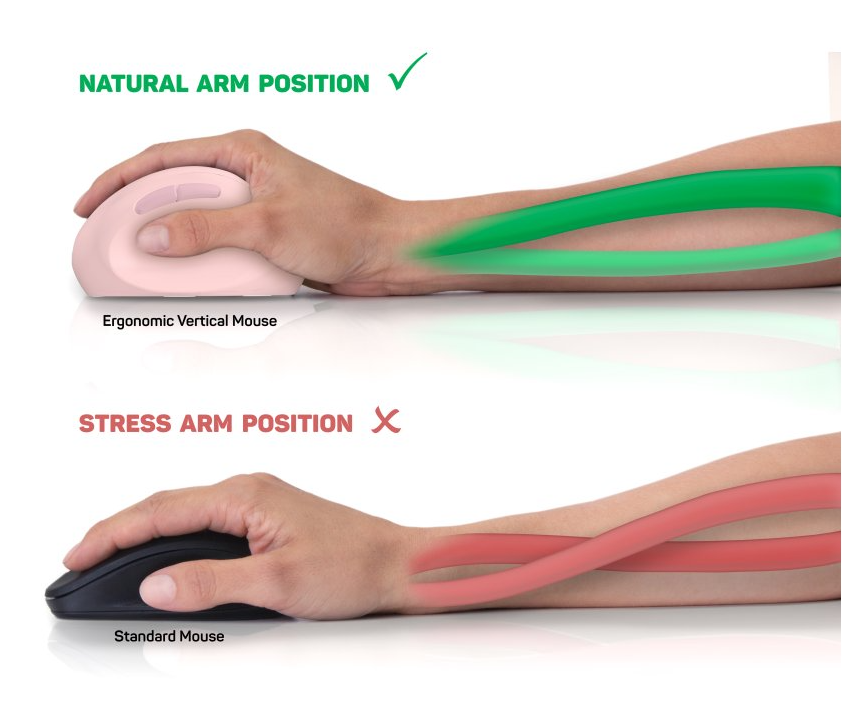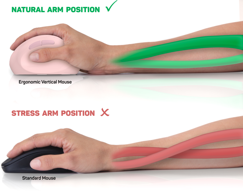 Běžné počítačové myši vedou ke křížení kostí předloktí, což může způsobovat nepohodlí nebo dokonce syndrom karpálního tunelu. Tato myš drží vaši ruku v přirozené poloze a snižuje tlak na střední nerv, čímž pomáhá předcházet bolestem, mravenčení a únavě.