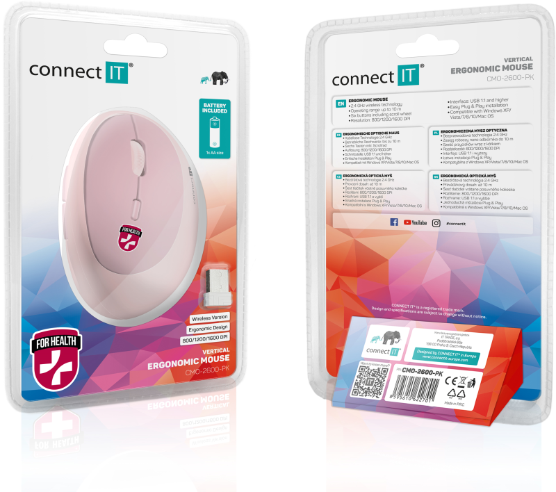 Pohodlí, ergonomie a prevence v jednom – vertikální bezdrátová myš Connect IT For Health (CMO-2600-PK) je navržena speciálně pro prevenci syndromu karpálního tunelu. Díky svému ergonomickému tvaru udržuje ruku a předloktí v přirozené poloze, čímž pomáhá snižovat únavu i bolest při dlouhodobém používání.