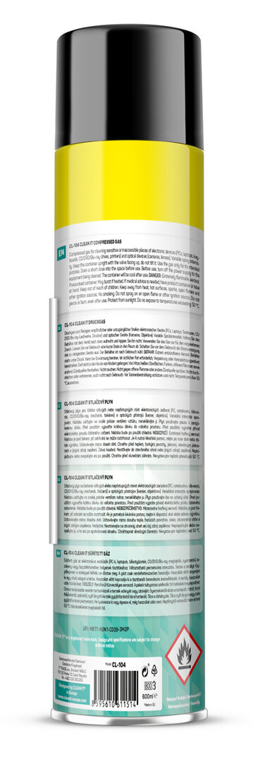 Stlačený plyn pro čištění (vyfoukávání) citlivých nebo nepřístupných míst elektronických zařízení (PC, notebooků, klávesnic, CD/DVD/Blu-ray mechanik, tiskáren atd.) a optických přístrojů (kamer, objektivů). Kód produktu: CL-104