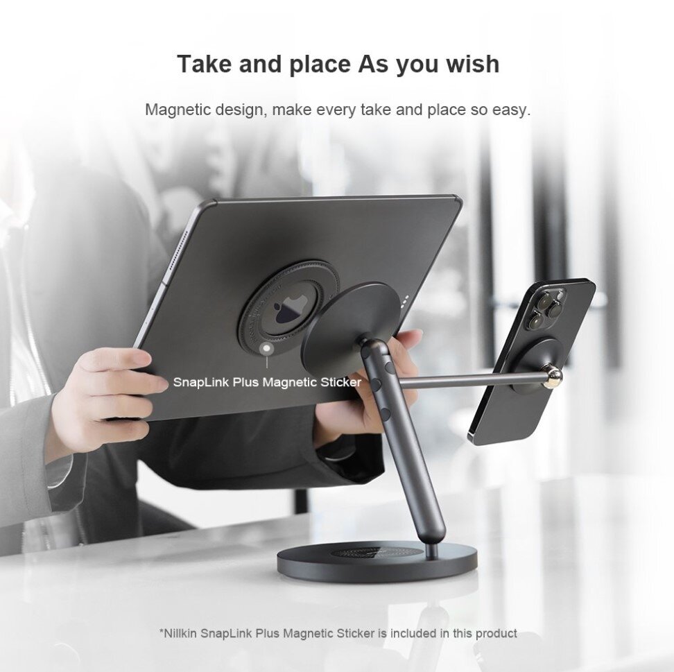Umožňuje vzájemnou spolupráci více zařízení a snadné přepínání mezi obrazovkami, zrcadlení či projekce. Díky magnetickému designu je každé vzetí a umístění tak snadné. Základna s 360° rotací vám umožní ukázat obrazovku ostatním pouhým otočením. Díky protiskluzové podložce je velmi stabilní.