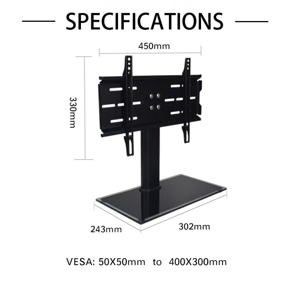 Stolní TV stojan pro úhlopříčky 26″–42″ s výškovým nastavením a stabilní konstrukcí. Elegantní černé provedení, VESA až 400×300 mm. Stylové a stabilní řešení pro umístění televizoru bez vrtání do zdi.