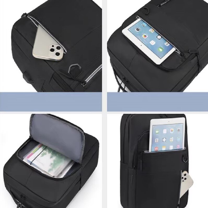 - Přehledné uložení: Batoh nabízí několik kapes a přihrádek pro uložení příslušenství, jako jsou nabíječky, myši, USB kabely, dokumenty a další potřeby.