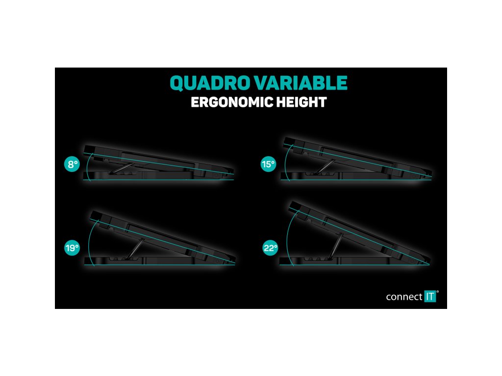 Podložka využívá čtyři ventilátory s nastavitelnou intenzitou, které zajišťují optimální proudění vzduchu pod notebookem a jeho chlazení i při náročném provozu. Cirkulace chladného vzduchu pomáhá chránit komponenty a stabilizovat výkon zařízení.