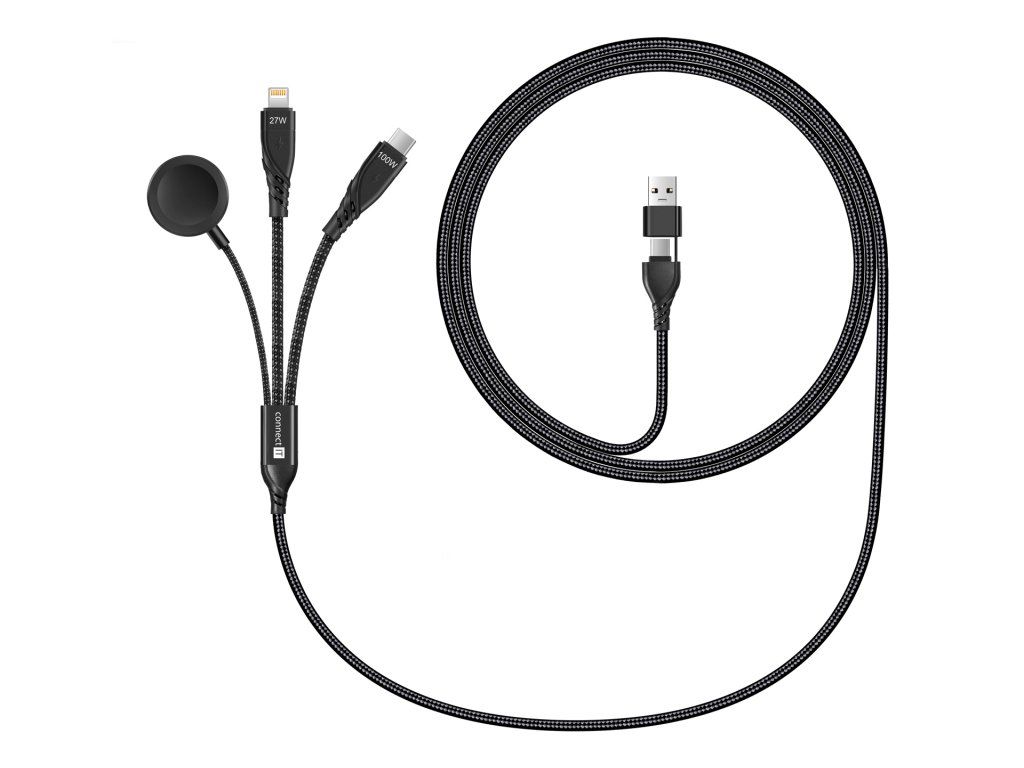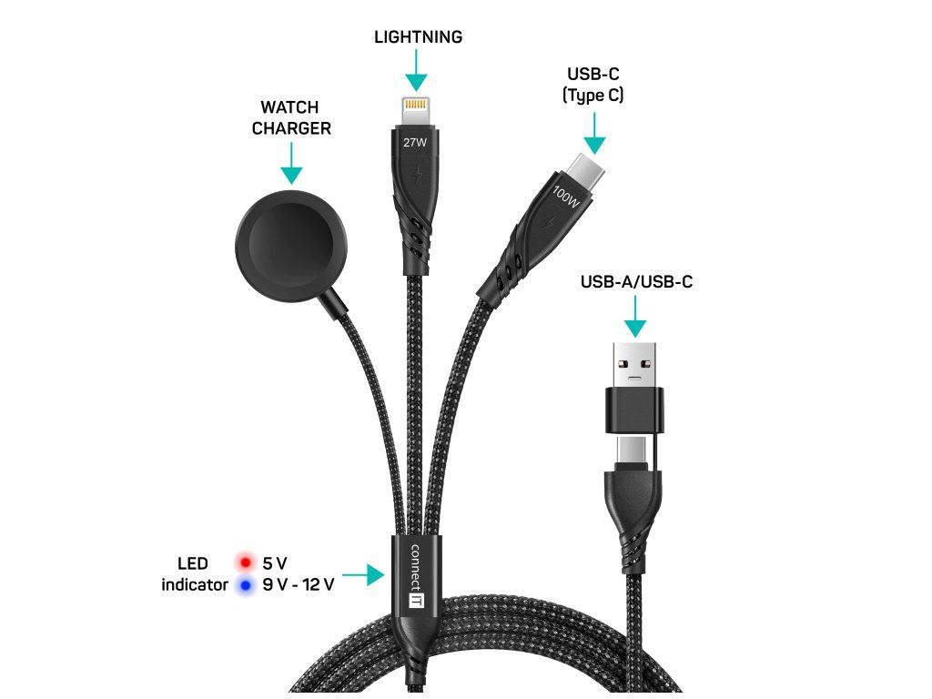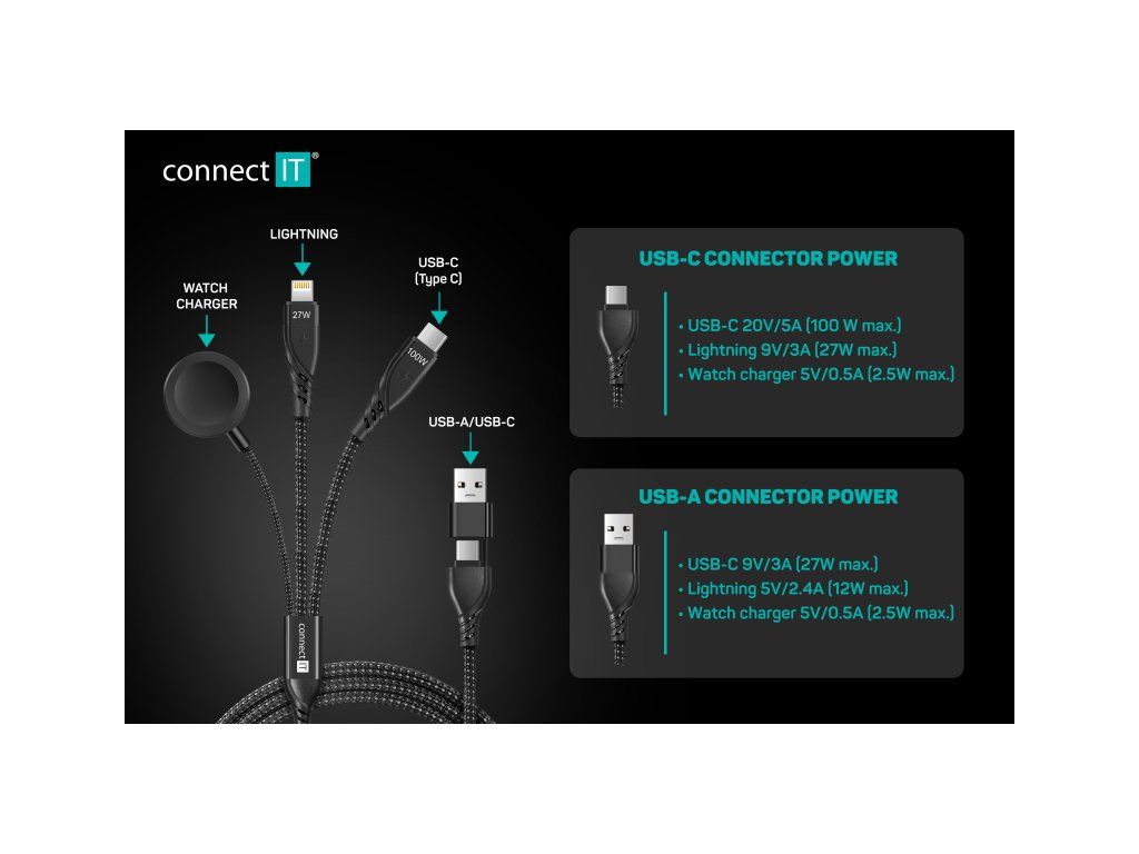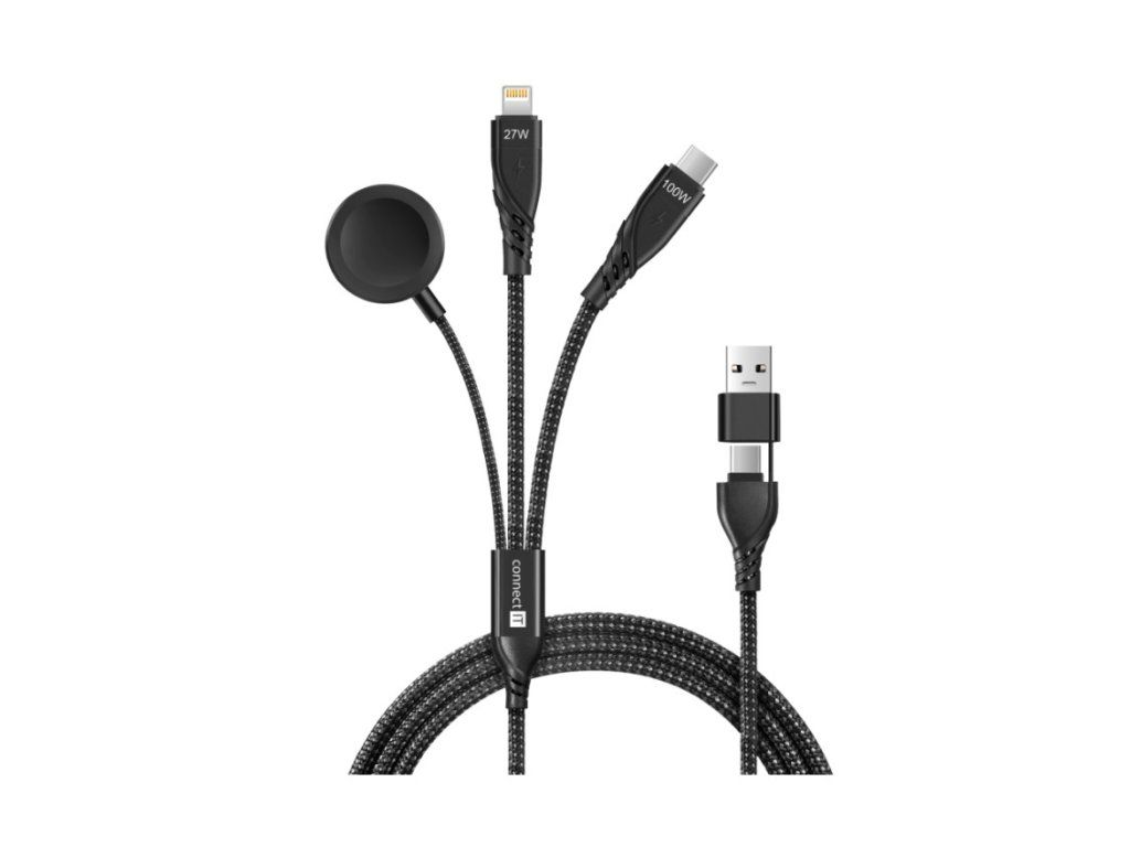 Connect IT Wirez datový kabel, 6v1, USB/USB-C na Lightning + USB-C + Watch Charger, 1.2m – černá