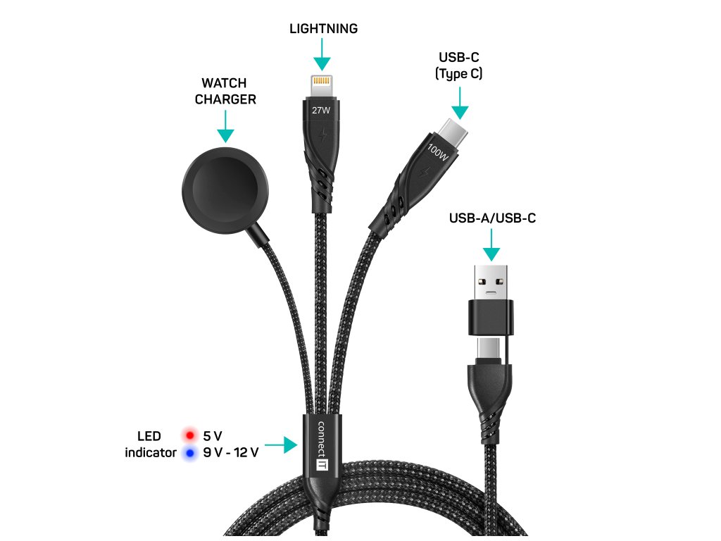 Univerzální řešení pro nabíjení tří zařízení najednou. Tento kvalitní 6v1 kabel značky Connect IT spojuje kompaktní design s maximální funkčností. Umožňuje nabíjet zařízení s konektory USB-C, Lightning a nabíječkou pro chytré hodinky (Apple Watch), přičemž vstupní konektor USB-C je doplněn o praktickou redukci na USB-A. Prémiové materiály zajišťují dlouhou životnost a spolehlivý přenos energie.