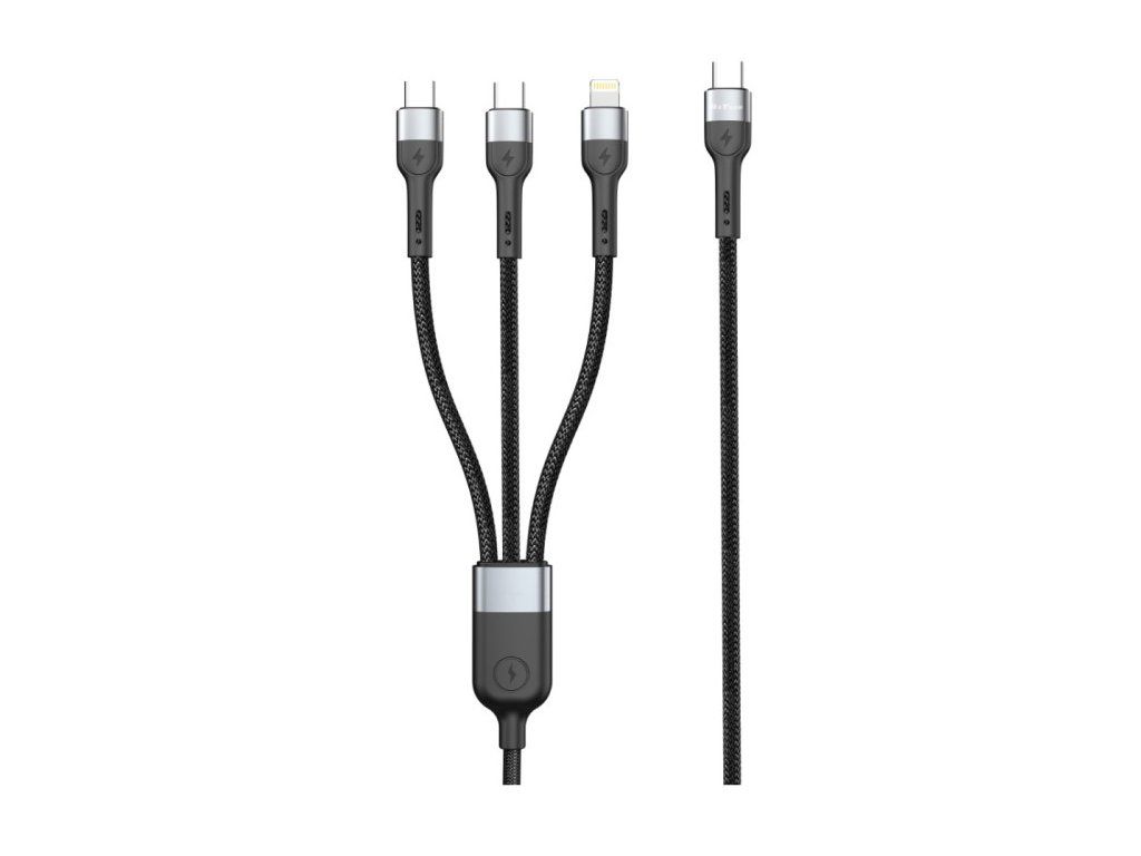 DeTech DE-51CCL datový kabel, 3v1, Type-C na 2x Type-C, Lightning, 1.0m - černá