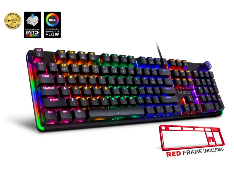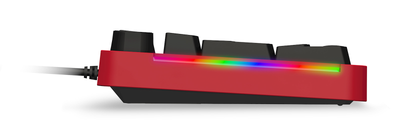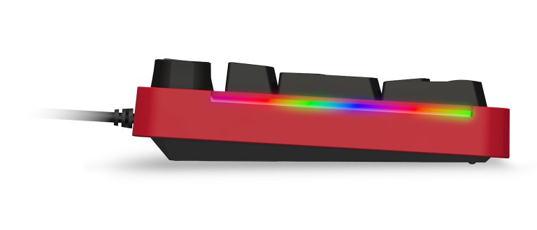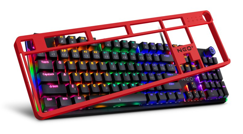Mechanická herní klávesnice CZ/SK s RGB podsvícením, 12 multimediálními klávesami a otočným kolečkem. Stylový červený rámeček v balení a precizní spínače s životností 50 milionů kliků.