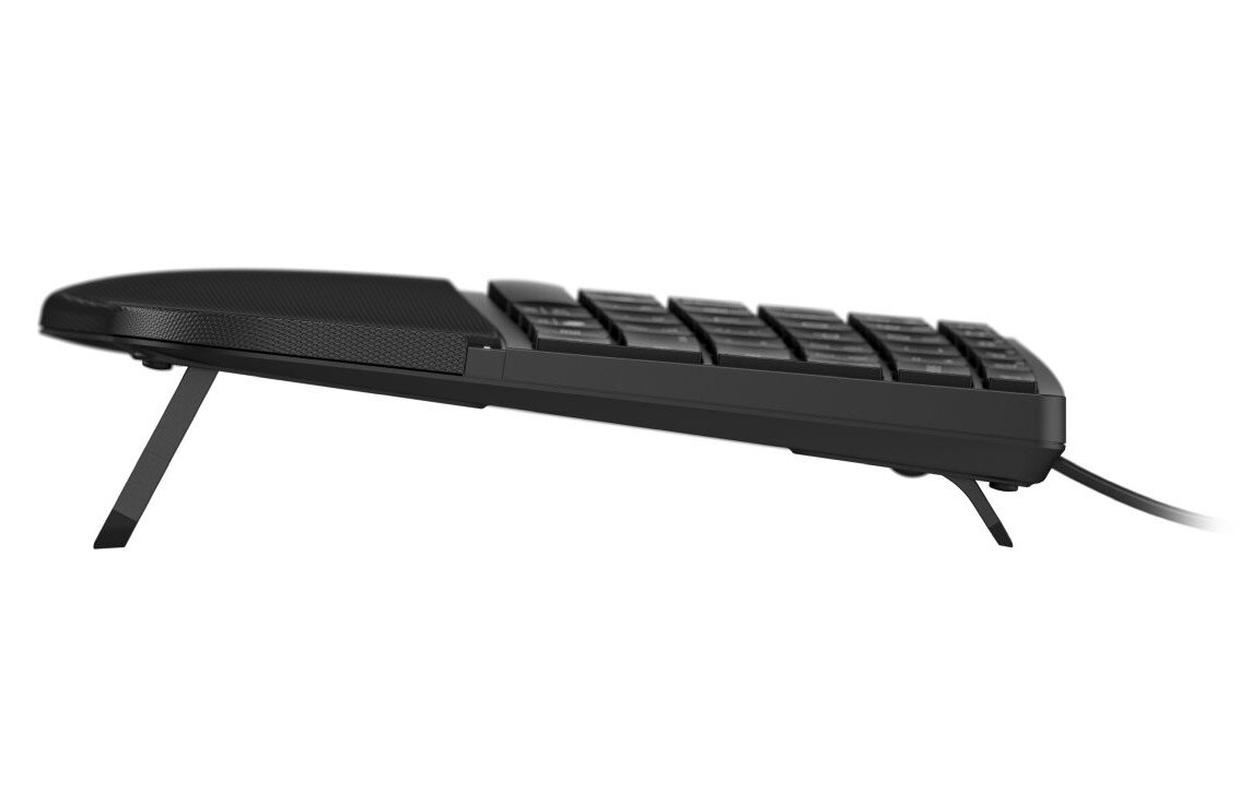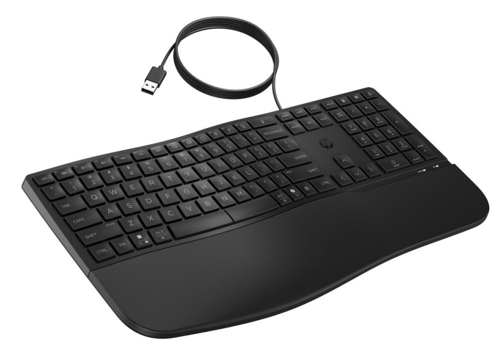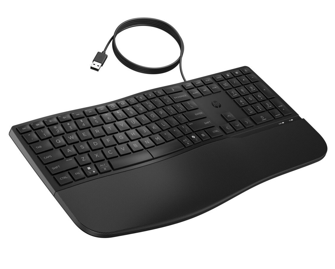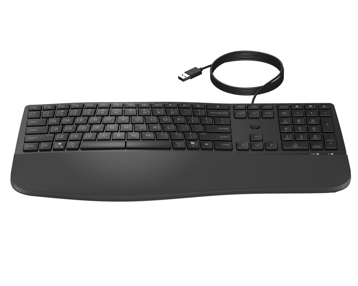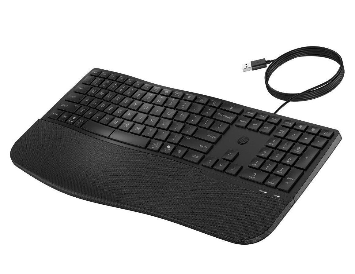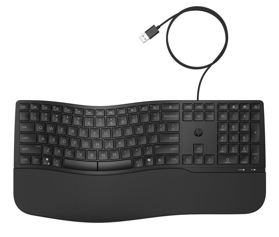 Ergonomická kabelová klávesnice HP 480 Comfort (8T6M1AA#BCM) s třemi polohami náklonu, 23 programovatelnými klávesami a funkcemi pro celodenní pohodlné psaní.