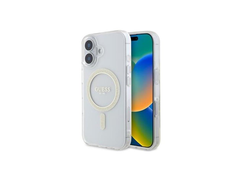 Guess IML Glitter Ring MagSafe Zadní Kryt pro iPhone 16 Transparent