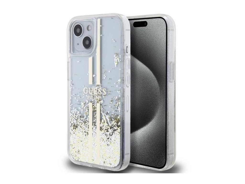 Guess PC/TPU Liquid Glitter Gold Stripe Zadní Kryt pro iPhone 15 Plus Transparent