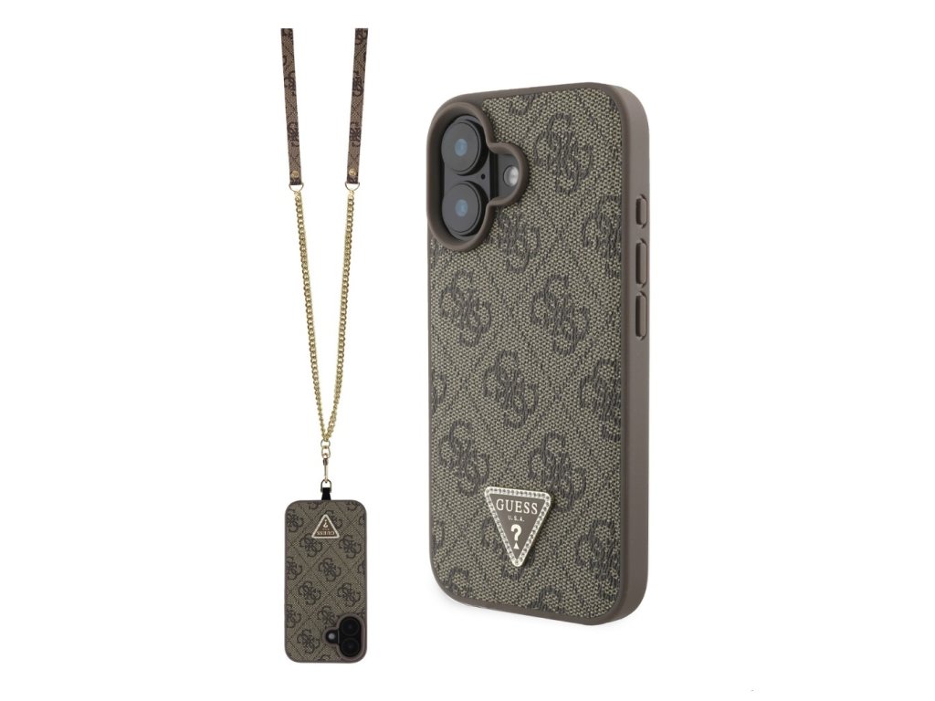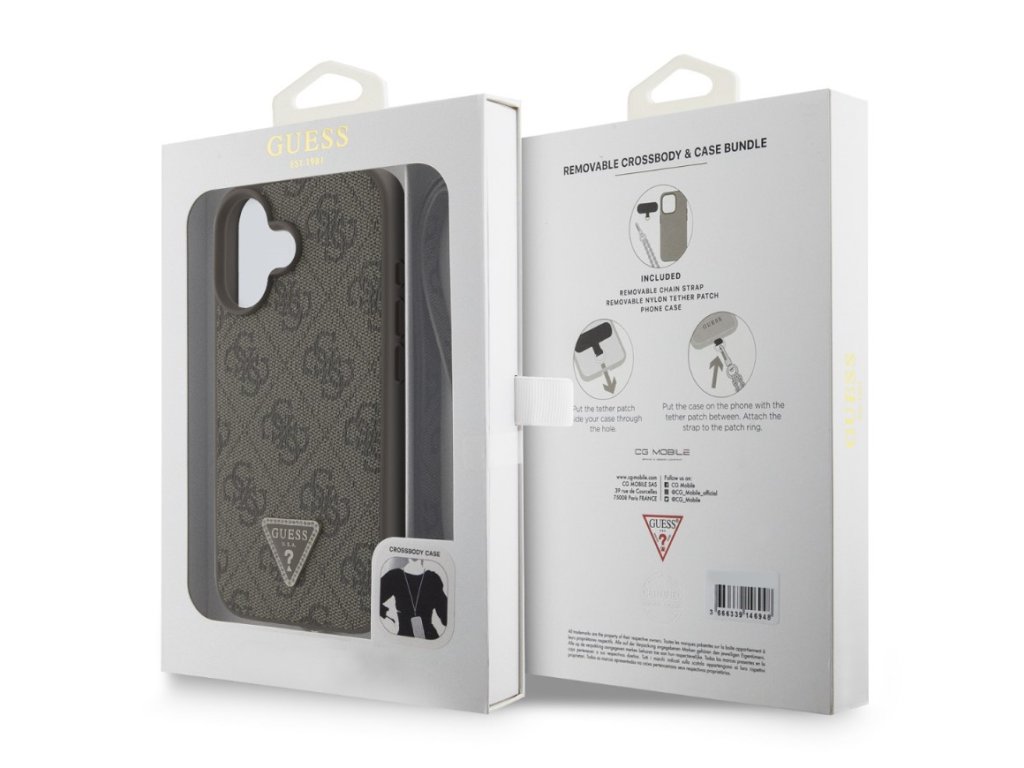 Guess PU 4G Strass Triangle Metal Logo Zadní Kryt + Crossbody Popruh pro iPhone 16 Brown