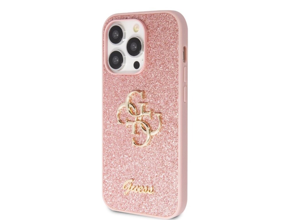 Guess PU Fixed Glitter 4G Metal Logo Zadní Kryt pro iPhone 15 Pro Růžový