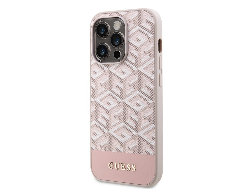 Guess PU G Cube Magnetic prémiový ochranný kryt telefonu v kombinaci zadní strany s potažená látkou s motivem Guess, pružnými PU boky a vestavěným magnetem pro Apple MagSafe příslušenství.