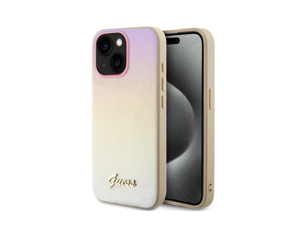 Guess PU Leather Iridescent Metal Script Zadní Kryt pro iPhone 15 Gold