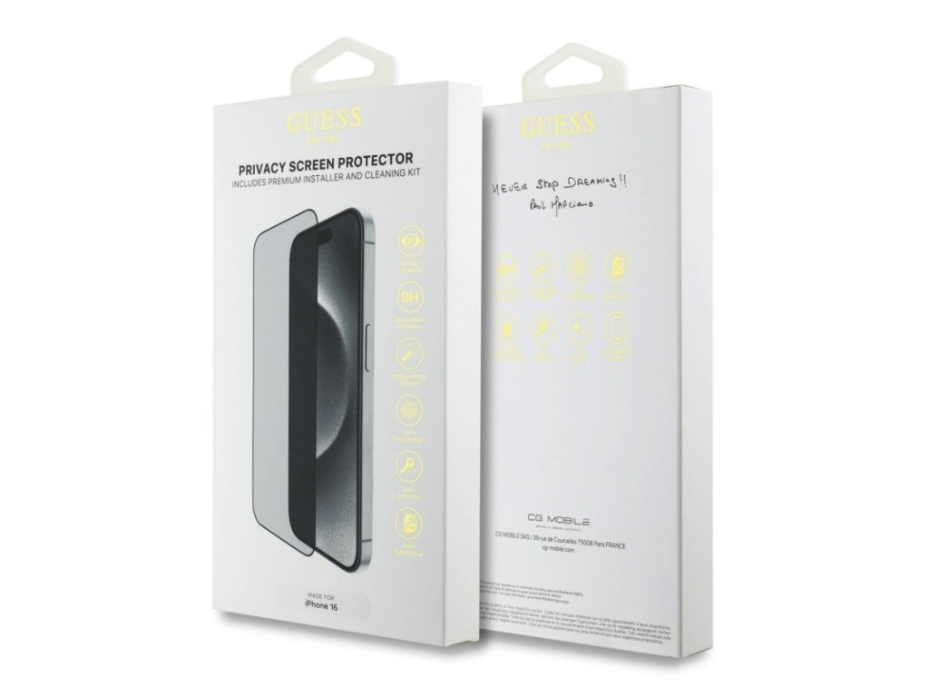 Guess Tvrzené Sklo 2.5D PRIVACY poskytuje Vašemu telefonu špičkovou ochranu proti škrábancům, prasklinám i nečistotám a zároveň chrání Vaše soukromí.