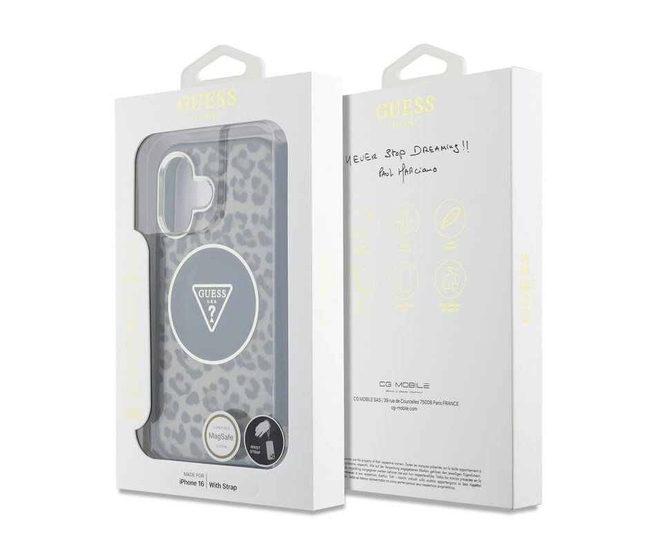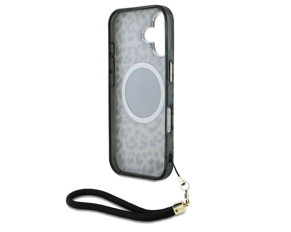 Dodejte svému iPhonu 16 šelmový styl s krytem Guess Leopard Strap MagSafe.