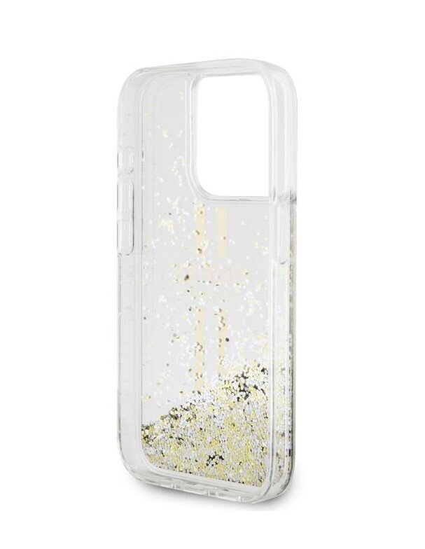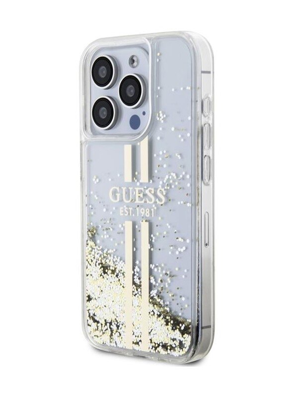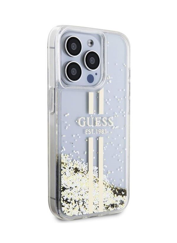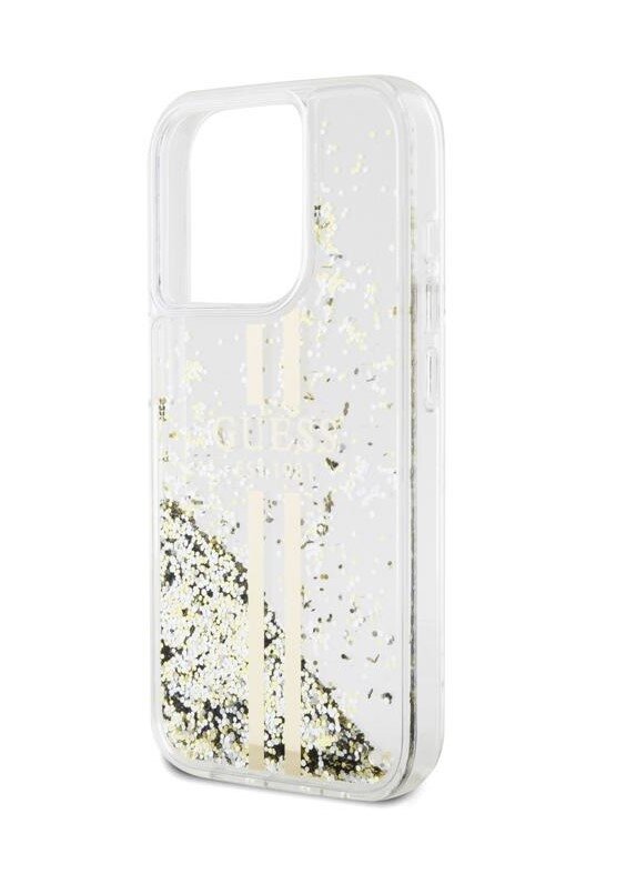 Guess PC/TPU Liquid Glitter Gold Stripe Zadní Kryt pro iPhone 15 Pro Transparent