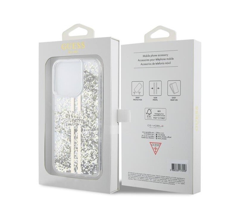 Guess TPU Liquid Glitter Gold Stripe je značkový kryt vyrobený z měkkého a odolného plastu s atraktivními glittery uvnitř, které se přesýpají.
