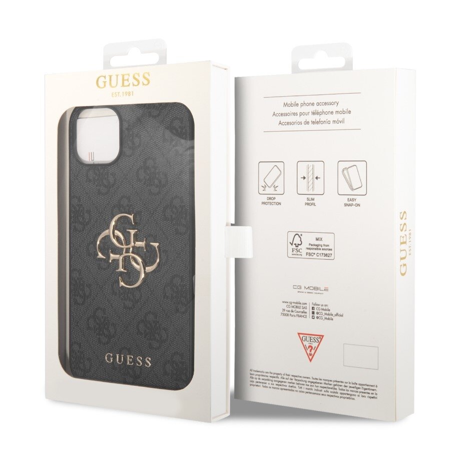 Prémiový ochranný kryt Guess PU 4G Metal Logo pro iPhone 15 Plus.