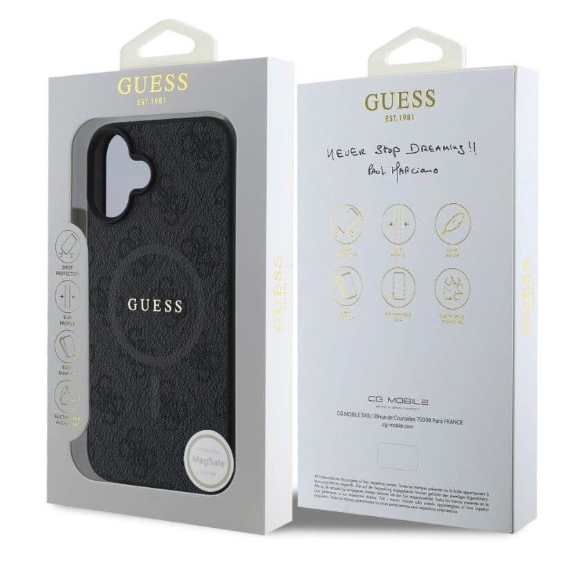 Elegantní ochrana s podporou MagSafe Zadní kryt Guess PU Leather 4G Colored Ring pro iPhone 16 v černé barvě kombinuje luxusní vzhled, ochranu a moderní technologie. Prémiové zpracování z umělé kůže s ikonickým 4G vzorem a integrovanou podporou MagSafe zajišťuje snadné bezdrátové nabíjení a bezpečné uchycení příslušenství.