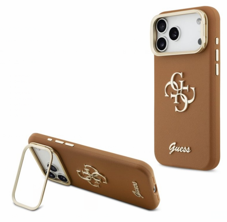 Guess zadní kryt pro iPhone 17 Pro Max, PU Grained 4G Logo Stand Camera Frame - hnědá