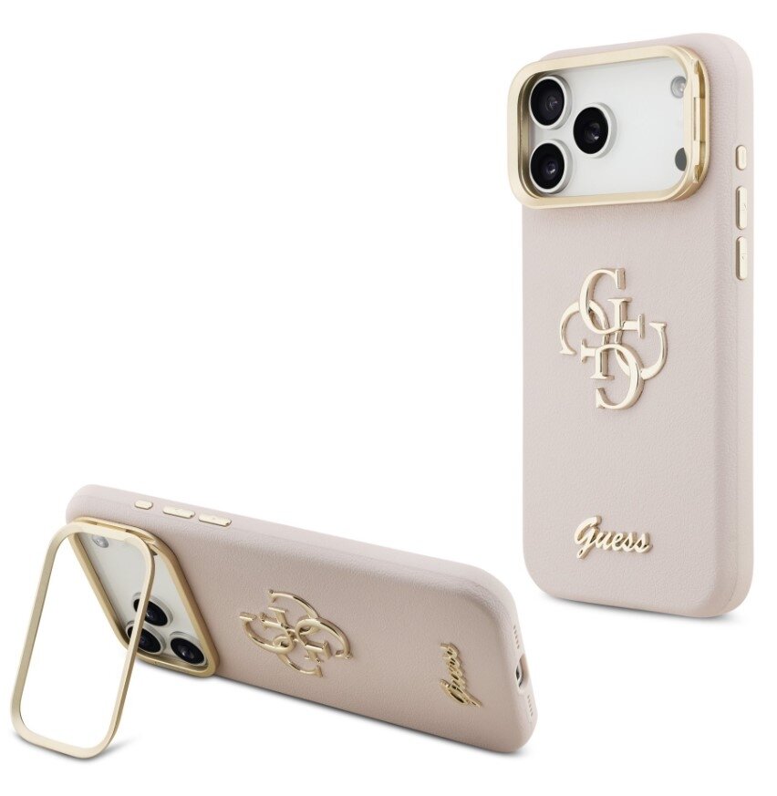 Guess zadní kryt pro iPhone 17 Pro Max, PU Grained 4G Logo Stand Camera Frame - růžová