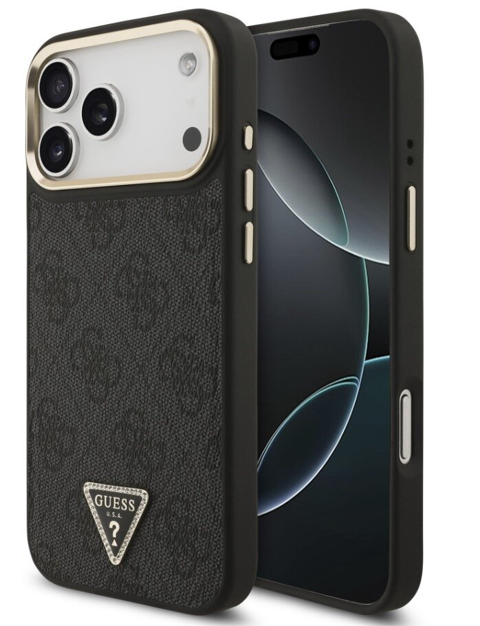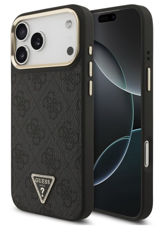Guess zadní kryt pro iPhone 17 Pro Max, PU Kůže 4G Triangle Logo Gold Frame MagSafe - černá