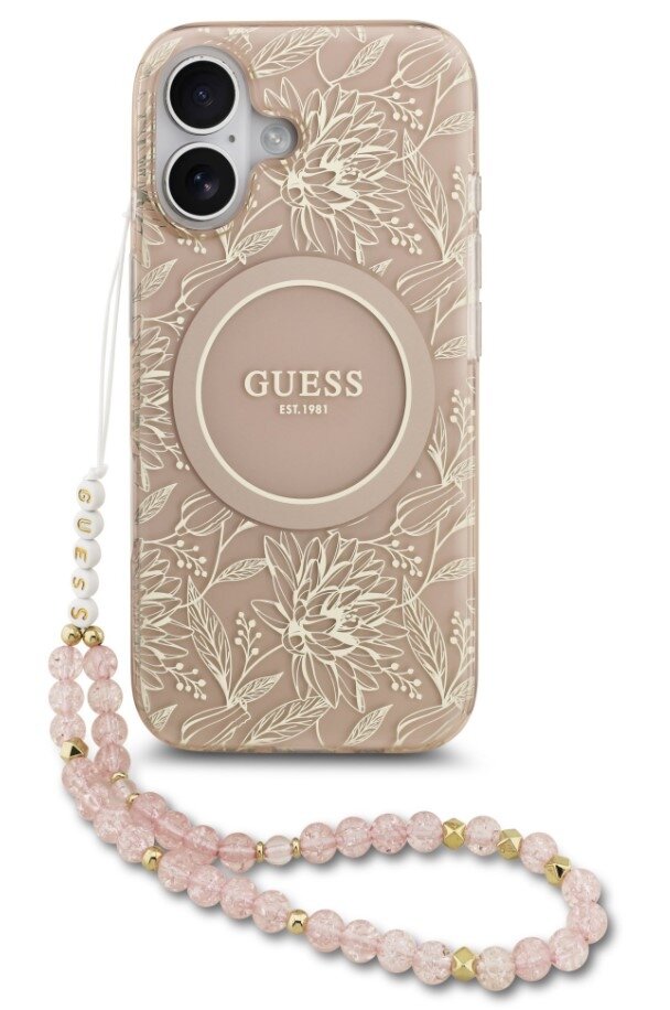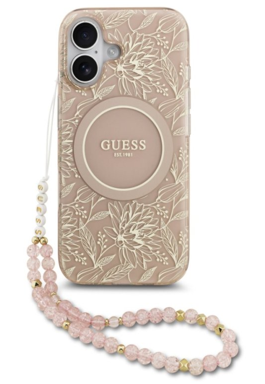 Stylový Guess kryt (GUHMP17SHCPOFPP) s květinovým motivem a korálkovým poutkem na ruku přináší pohodlí, bezpečnost i eleganci. Kombinace PC (polykarbonát) a TPU (termoplastický polyuretan) zajišťuje odolnost, zatímco podpora MagSafe umožňuje bezdrátové na