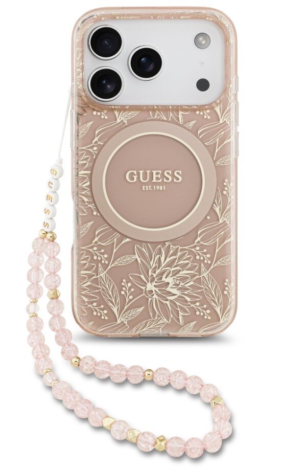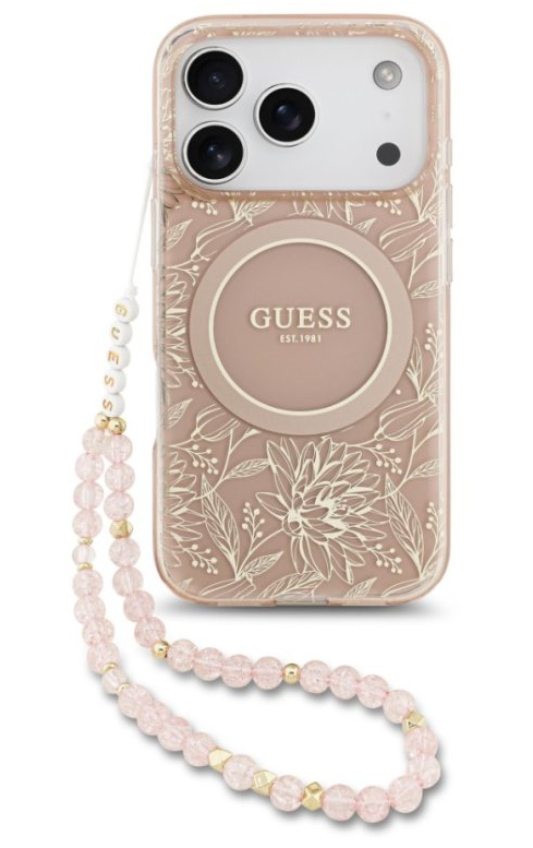 Stylový Guess kryt (GUHMP17LHCPOFPP) s květinovým motivem a korálkovým poutkem na ruku přináší pohodlí, bezpečnost i eleganci. Kombinace PC (polykarbonát) a TPU (termoplastický polyuretan) zajišťuje odolnost, zatímco podpora MagSafe umožňuje bezdrátové na