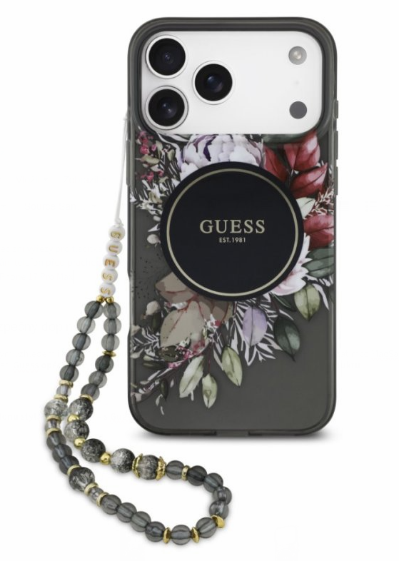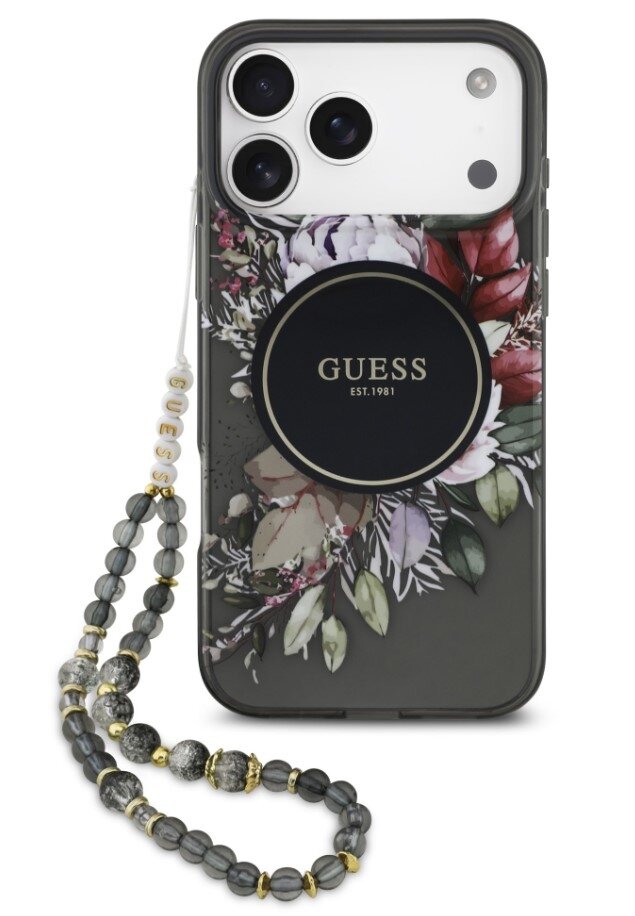 Stylový Guess kryt (GUHMP17XHFWBRCESK) s květinovým motivem a korálkovým poutkem na ruku přináší pohodlí, bezpečnost i eleganci. Kombinace PC (polykarbonát) a TPU (termoplastický polyuretan) zajišťuje odolnost, zatímco podpora MagSafe umožňuje bezdrátové