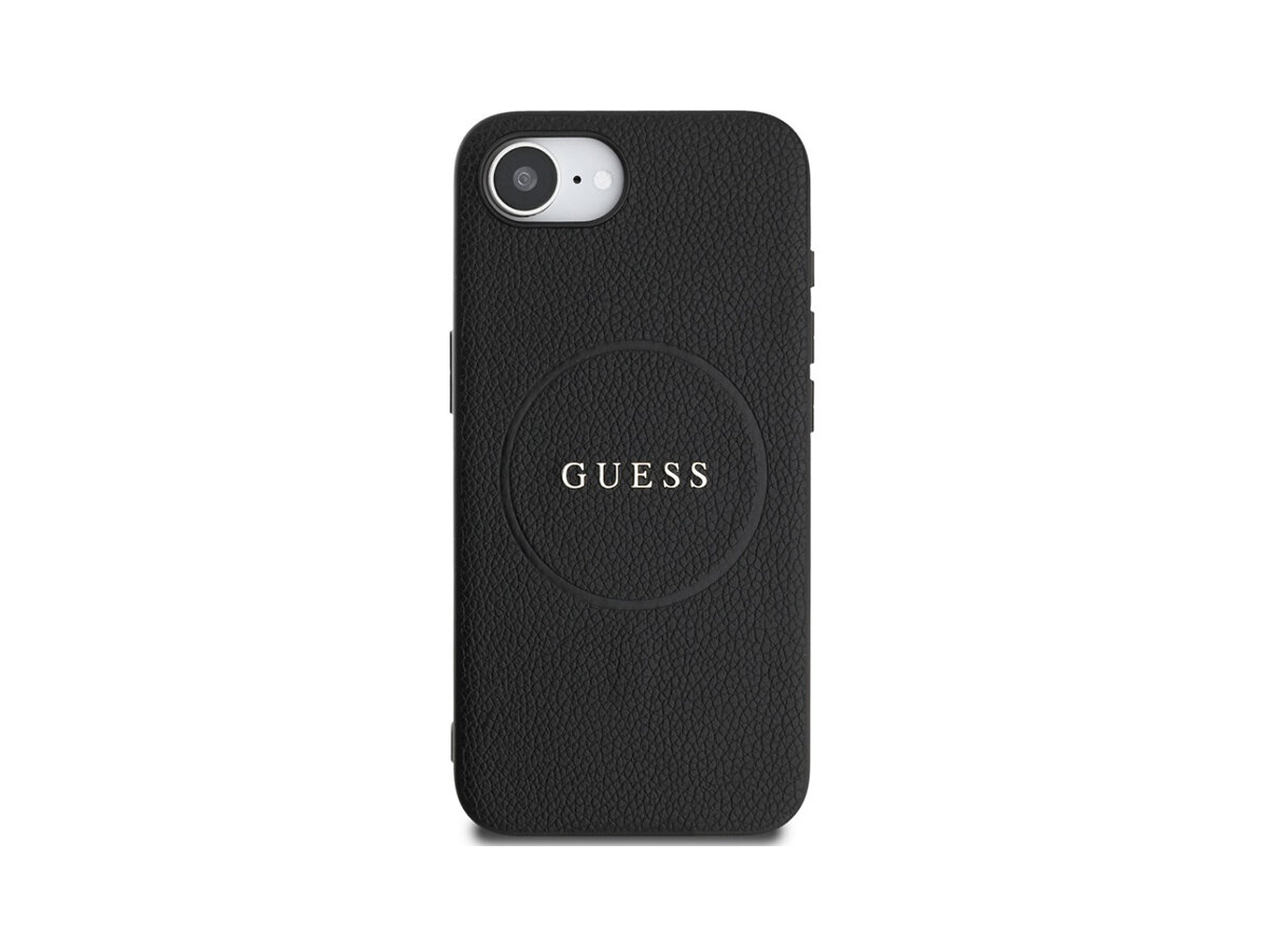 Luxusní černý zadní kryt s klasickým logem Guess a technologií MagSafe, poskytující bezpečné připevnění a ochranu pro iPhone 16e.