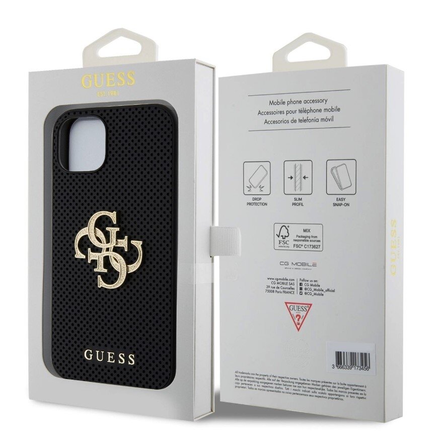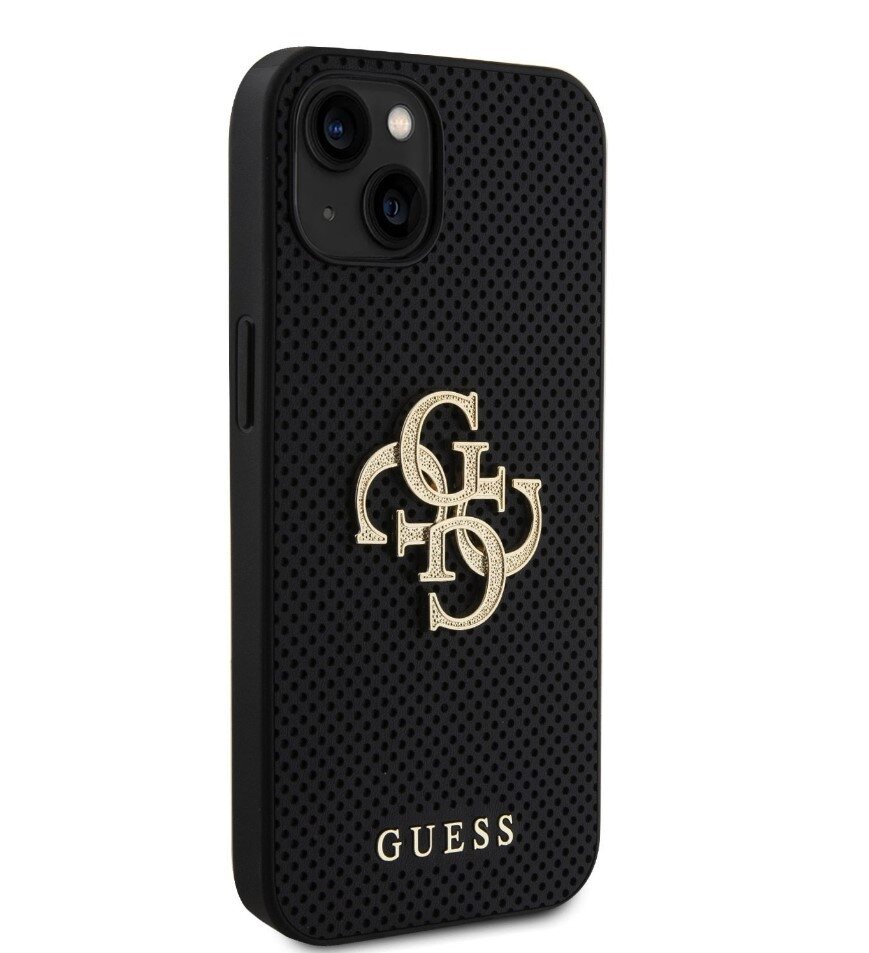 Prémiový ochranný kryt Guess PU Perforated 4G Glitter Metal Logo pro iPhone 15.