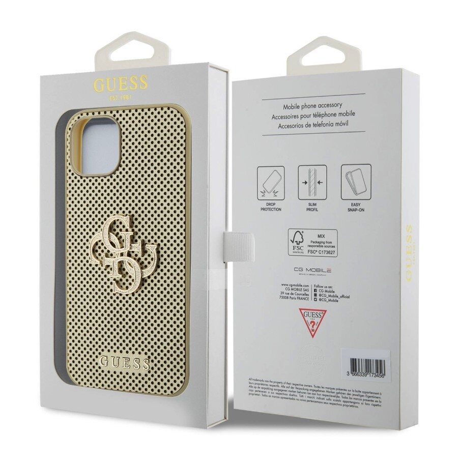 Prémiový ochranný kryt Guess PU Perforated 4G Glitter Metal Logo pro iPhone 15.