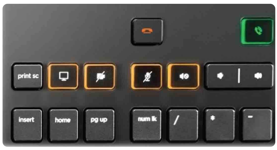Jednou z hlavních předností klávesnice HP Conferencing Keyboard jsou vyhrazené klávesové zkratky a podsvícené ovládací klávesy určené přímo pro online komunikaci. Umožňují rychlé spuštění nebo ovládání funkcí, jako je hovor, sdílení obrazovky nebo zapnutí či vypnutí videa.