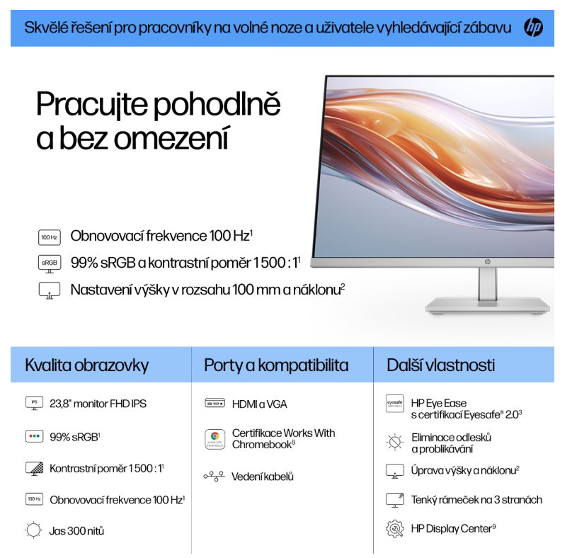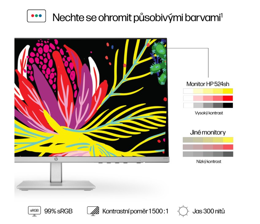 Díky svému formátu je HP 524sh ideální pro práci, studium i volný čas. Poskytuje dostatečný obrazový komfort bez přehnaných funkcí, které by zvyšovaly cenu – skvělá volba pro každodenní použití.