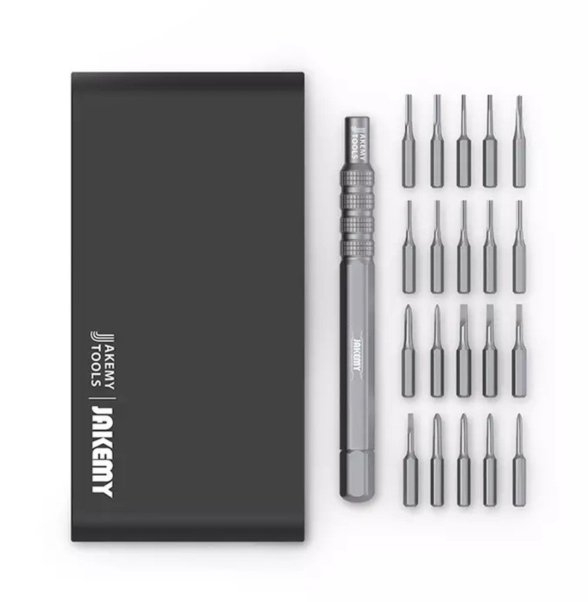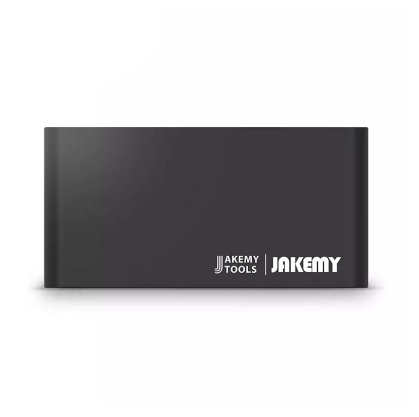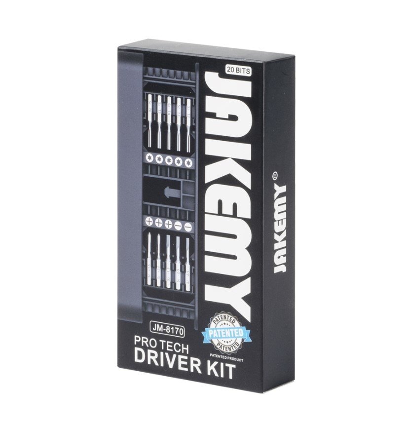 Jakemy JM-8170 je sada šroubováků a bitů, která obsahuje 20 kusů různých typů bitů, jako jsou Torx, Flat-head, Philips, Tri-Wing, Pentalobe a Stand off. Bity jsou vyrobeny z S2 oceli a mají černou barvu. Šroubovák je vyroben z lehkého hliníku a má protáčející koncovku rukojeti s kuličkovým ložiskem pro snadné šroubování. Sada je vhodná pro opravu drobné elektroniky na cestách nebo u zákazníka. Sada je dodávána v praktickém balení s organizérem bitů.