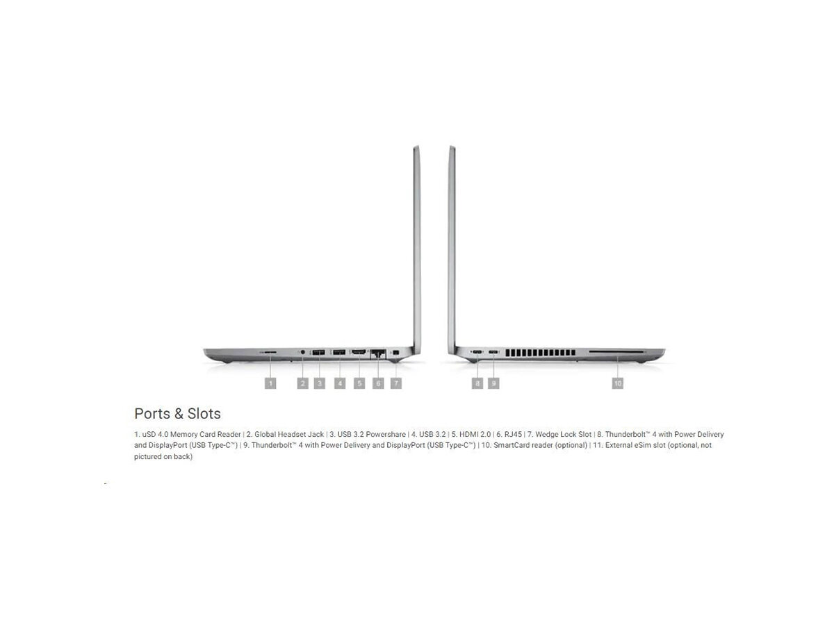 1. Čtečka paměťových karet uSD 4.0 | 2. Globální konektor na náhlavní soupravu | 3. USB 3.2 Powershare | 4. USB 3.2 | 5. HDMI 2.0 | 6. Port RJ45 | 7. Slot pro bezpečnostní zámek Wedge | 8. Port Thunderbolt™ 4 s napájením a portem DisplayPort (USB Type-C™) | 9. Port Thunderbolt™ 4 s napájením a portem DisplayPort (USB Type-C™) | 10. Čtečka čipových karet (volitelné příslušenství) | 11. Externí slot na kartu eSim (volitelný, nezobrazuje se vzadu)