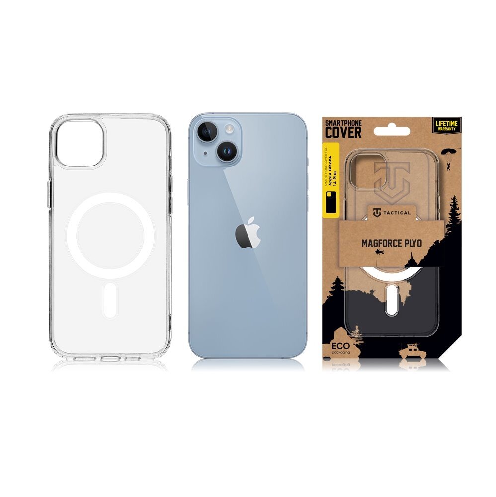 Tactical MagForce je tenký čirý PC/TPU kryt na záda telefonu. Je vyrobený z dokonale čirého pružného silikonového materiálu a je dodáván v ekologickém balení z recyklovaného papíru. Kryt je vyroben z kombinace dvou materiálů. Pevného polykarbonátu na zadní straně a TPU pružného materiálu na bocích. Specialitou je silný magnet pro Apple MagSafe příslušenství. Navíc díky použitému polykarbonátu se nestane, že kryt zežloutne vlivem zahřívání při nabíjení. Kryt kryje celá záda, boky a rohy telefonu a chrání ho tak při pádu, ale i při každodenním používání. Hlavním dva plusy tohoto krytu jsou, že sedí přesně na daný typ telefonu a zároveň zůstávají plně dostupné všechny ovládací prvky a konektory a že ochraňuje nejzranitelnější část telefonu jakou jsou jeho rohy. Navíc lehce vyvýšené okraje chrání displej telefonu v případě že pokládáte telefon displejem dolů. Pokud preferujete kryt, který nebude rušit vzhled telefonu a chcete aby byla vidět i barva telefonu, je Tactical MagForce volba přesně pro vás. Navíc jak je u značky Tactical zvykem, balení je kompletně vyrobeno z recyklovaného papíru.