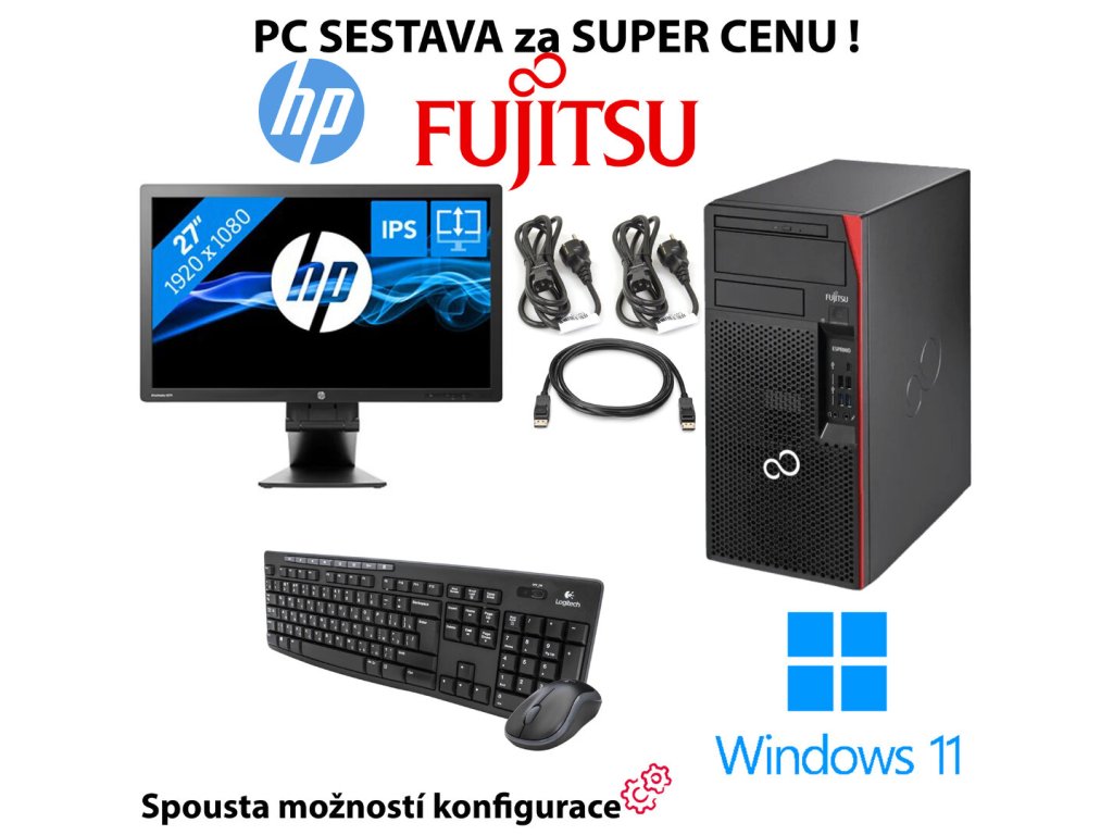 Jednoduše svižná a spolehlivá PC sestava s klávesnicí, myší, veškerými potřebnými kabely a obrovským 27" monitorem s technologií IPS - to vše stylově od výrobce HP a Fujitsu.