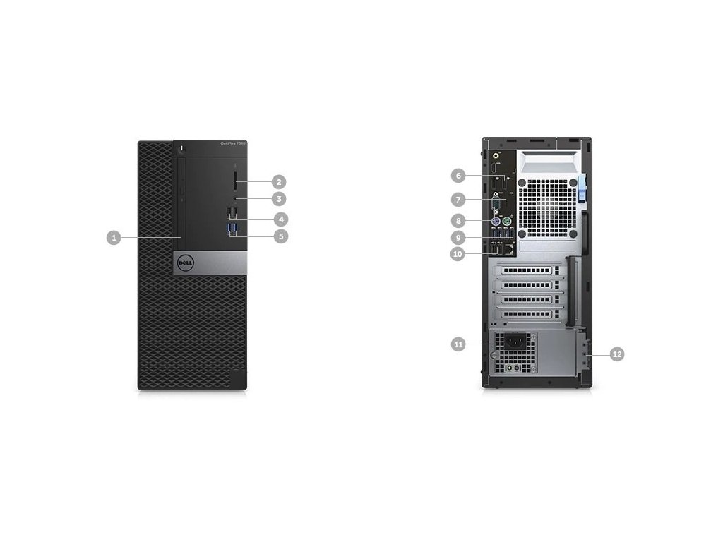 1. 9,5mm tenká optická jednotka | 3. Univerzální zvukový konektor typu Jack | 4. Porty USB 2.0 (1 s funkcí PowerShare) | 5. Porty USB 3.0 | 6. Nativní podpora 3 digitálních výstupů videa (DP, DP a HDMI) | 7. Volitelný výstup VGA (není na obrázku) | 8. Sériový port | 9. Další porty USB 3.0 | 10. Port USB 2.0 s funkcí smart power on | 11. Volitelný zdroj napájení Platinum s 92% účinností | 12. Standardní bezpečnostní slot