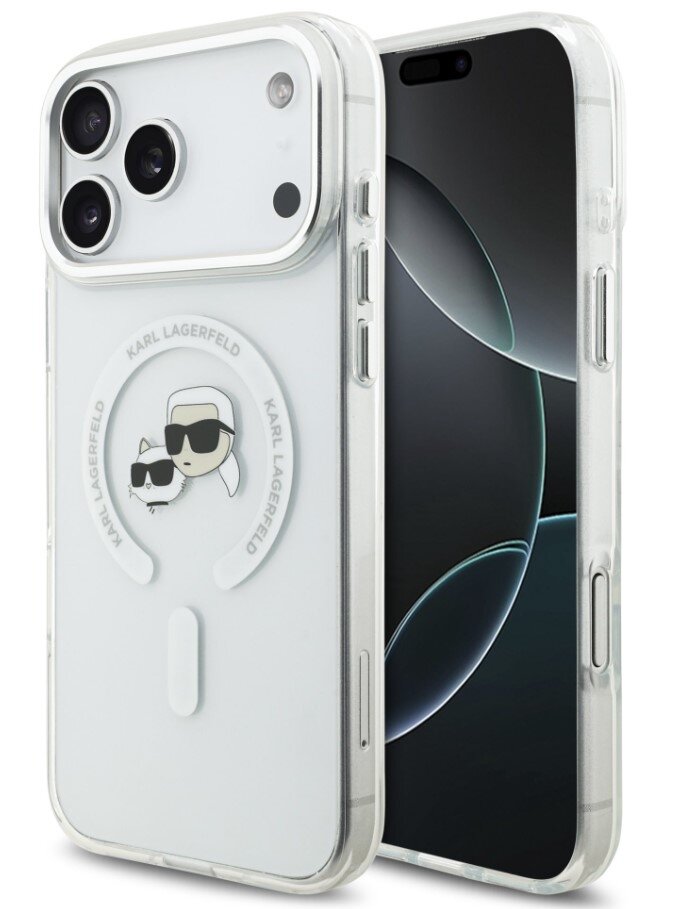 Karl Lagerfeld zadní kryt pro iPhone 17 Pro Max, IML K&Ch Heads Metal Frame MagSafe - průhledná