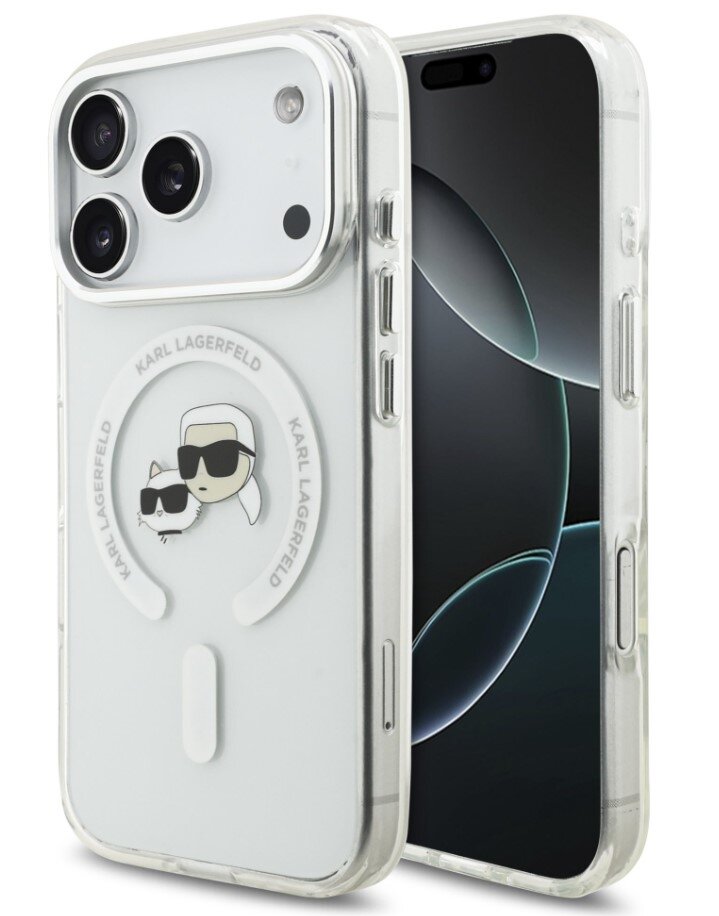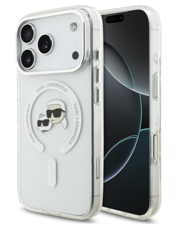 Karl Lagerfeld zadní kryt pro iPhone 17 Pro, IML K&Ch Heads Metal Frame MagSafe - průhledná